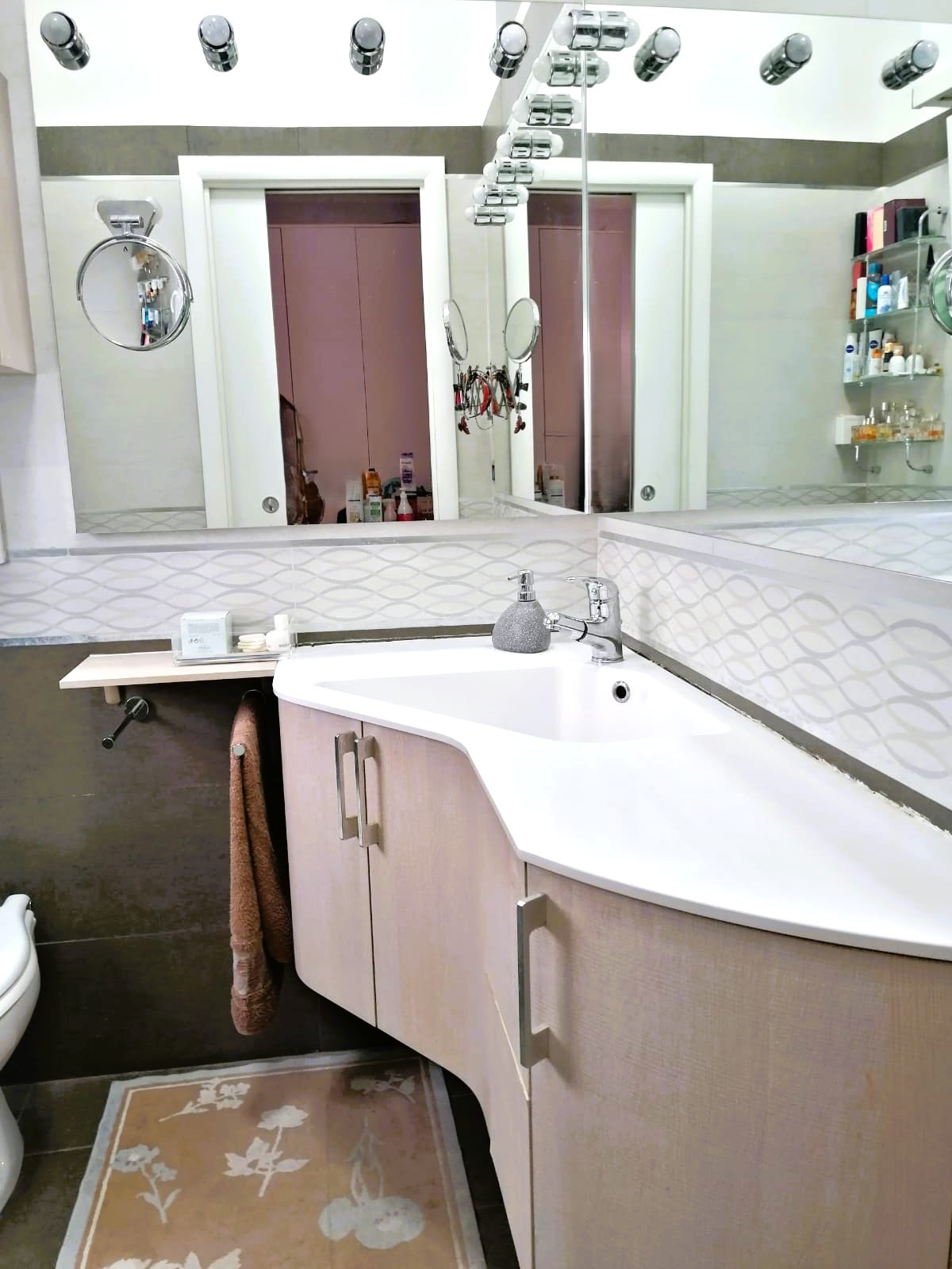 L’appartamento è composto da: ingresso, grande soggiorno con angolo cottura, balcone con veduta ampia, corridoio, ripostiglio, due camere da letto, due bagni di cui uno in camera matrimoniale, dotato dei soli servizi igienici e l’altro dotato di servizi igienici e doppio box doccia. Completa la proprietà una cantina di 12 mq circa, sita al piano seminterrato.